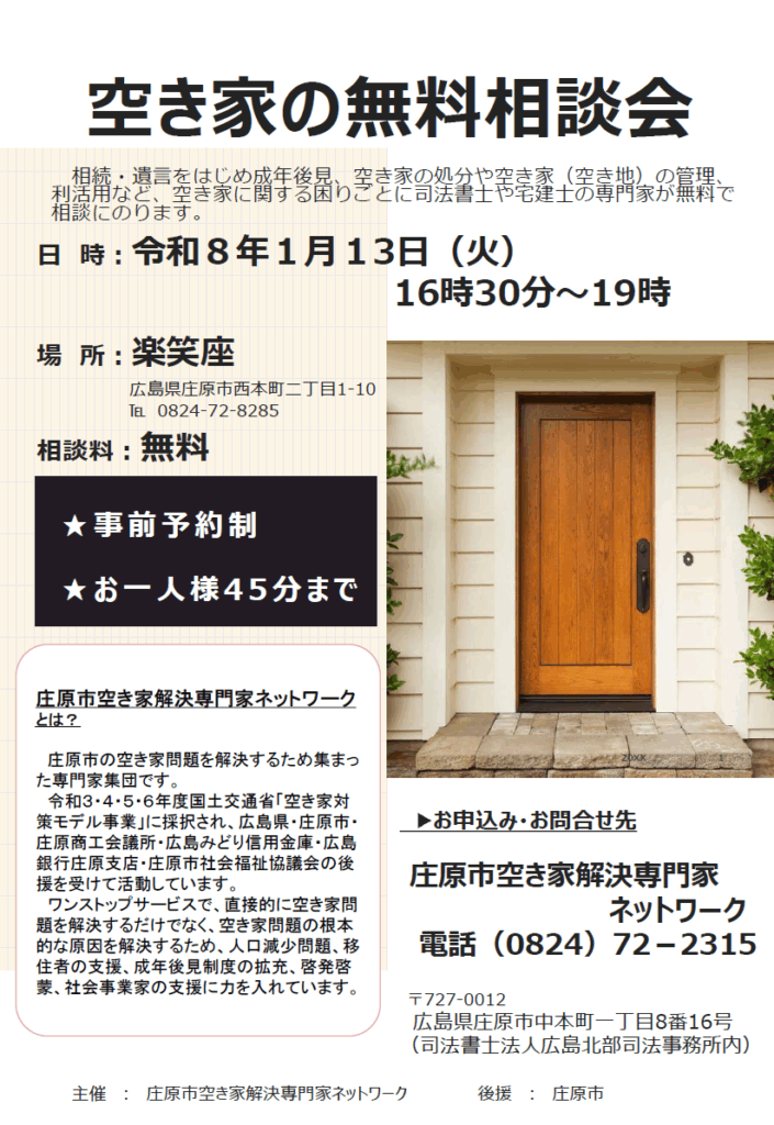令和8年1月13日(火)に楽笑座にて、16:30から無料相談会を行います。相続・相続登記義務化・遺言をはじめ成年後見、空き家の処分や空き家(空き地)の管理、利活用など、空き家に関する困りごとに、専門家が無料で相談に応じます。